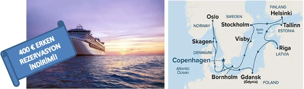 · 5* Sapphire Princess gemisinde 12 gece 13 gün tam pansiyon konaklama · Liman & Havalimanı vergileri (kişi başı 1000 €) · Havalimanı – Liman arası transferler · Son gün Kopenhag Şehir Turu · Gemide gün içerisinde gerçekleştirilen animasyon, aktiviteler ve gece düzenlenen şovlar · Gün boyu ikramlar, gece yarısı büfesi · 24 saat oda servisi (*Bazı servisler ücretlidir) · Yurtdışı Seyahat Sağlık Sigortası (70 yaş üzeri surprim uygulanır) · Türkçe rehberlik hizmeti (Grubun 20 kişi ve üzeri olması durumunda) |